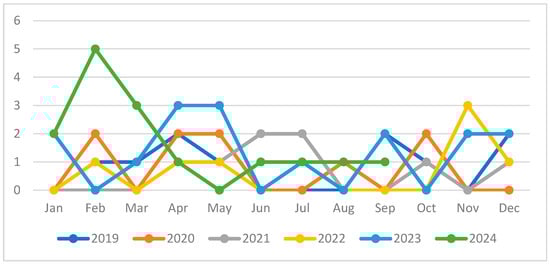 In 2019, ten children with pleural effusion were admitted to the ward. The number dropped to nine in 2020, then dropped to eight in 2021, and, in 2022, there were still eight. These subsequently increased significantly to sixteen hospitalizations in 2023 and fifteen in 2024. In total, nineteen children were hospitalized in winter (28.7%), twenty-three in the spring (34.8%), ten in the summer (15.1%), and fourteen in the autumn (21.2%). The graph below represents the distribution of cases by month of the year at the time of admission (Figure 1).