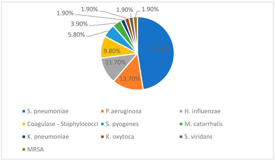 The figure below (Figure 3) represents the percentage distribution of bacterial isolates reported among the total of fifty-one positive cultures. Twenty-four positive cultures included S. pneumoniae, six were H. influenzae, seven were P. aeruginosa, and then five Coagulase negative Staphylococci, three S. pyogenes, two M. catarrhalis, and one each K. pneumoniae, K. oxytoca, S. viridans, and MRSA.