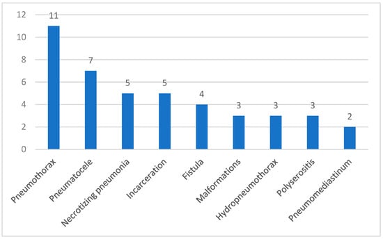 Less than a half of the patients were fully vaccinated with PCV13 (1, 3, 4, 5, 6A, 6B, 7F, 9V, 14, 18C, 19A, 19F, and 23F), although it is on the Romanian NIP. PCV20 (1, 3, 4, 5, 6A, 6B, 7F, 8, 9V, 10A, 11A, 12F, 14, 15B, 18C, 19A, 19F, 22F, 23F, and 33F) is not in the NIP and has been approved for pediatric use in the EU since March 2024. Considering that proper vaccination can prevent serious complications like empyema, necrosis, fistula, and lung abscesses [], it is easy to understand why so many children had multiple complications during their hospital stay.