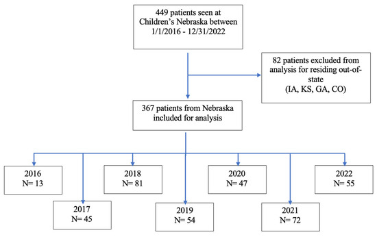A total of 449 patients were seen in Children’s Nebraska from 1 January 2016 to 31 December 2022 who met inclusion criteria, 336 males and 114 females (Figure 1).