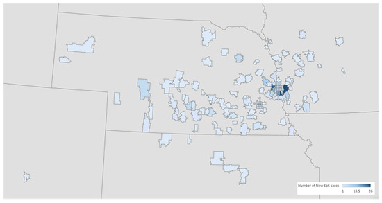 This study showed that the highest number of new EoE cases in the state of Nebraska were observed in Douglas County, Sarpy County, and Lancaster County, whereas the largest number of new cases of EoE outside of Nebraska were found in Pottawattamie County, Iowa (Figure 2). These are also the counties with the largest population in a 125-miles radius from Omaha, the largest city in Nebraska.