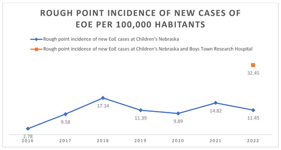 Rough point incidence of new EoE cases in Nebraska from a single academic center (Children’s Nebraska) and two academic centers (Children’s Nebraska and Boys Town National Research Hospital).