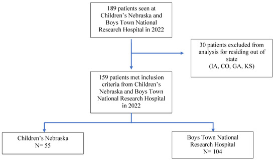 A second, different set of 120 patients seen at Boys Town National Research Hospital from 1 January 2022 to 31 December 2022 was identified. Most patients were from Nebraska (104 patients), with the remainder residing in Iowa (16 patients). The patients from Nebraska were 76 males and 28 females, with a male-to-female ratio of 2.71. Most patients identified as Caucasian (89 patients), 6 as Black or African American, 2 as Hispanic or Latino, 4 as Asian, 2 as Multiracial, and 1 as unknown/refused to provide information. The average age at the time of diagnosis in Boys Town National Research Hospital was 10.79.