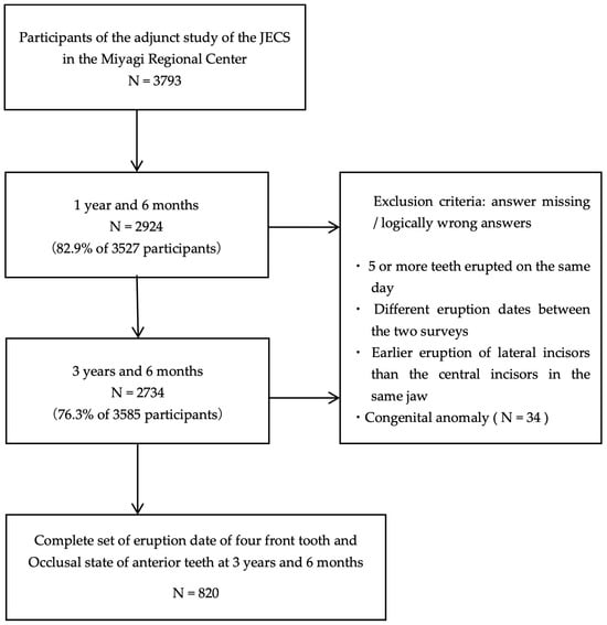 This study is an adjunct of the JECS conducted at the Miyagi Regional Centre. The study design of the JECS has been described previously [21]. Briefly, pregnant women were recruited from 15 regional centers, including the Miyagi Regional Centre, between January 2011 and March 2014. We included the following participants: (1) those residing in the study areas at the time of the recruitment and expected to reside continually in Japan for the foreseeable future, (2) those with an expected delivery date between 1 August 2011 and mid-2014, and (3) those able to participate in the study without difficulty, that is, they must be able to comprehend the Japanese language and complete the self-administered questionnaire. At the Miyagi Regional Centre, 9217 participants were registered during this period across 14 municipalities in Miyagi Prefecture. Of the 9217 participants, 3793 agreed to participate in the study, and written informed consent was obtained from all participants. Of the 3793 participants who agreed to participate in the supplementary study, 2924 and 2734 responded to the 1.5- and 3.5-year surveys, respectively. After excluding responses that met the exclusion criteria, 820 valid responses were obtained (Figure 1) from 416 male and 404 female participants. The exclusion criteria were missing and/or logically inconsistent responses. Examples of logically inconsistent answers included the eruption of five or more teeth on the same day, different eruption dates between the two surveys, and the earlier eruption of the primary lateral incisors compared to the primary central incisors in the same jaw. In addition, responses from participants with congenital anomalies were excluded (Figure 1).