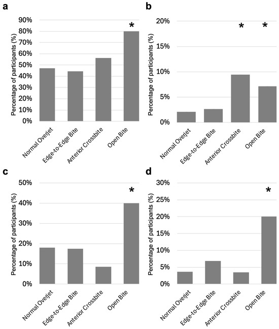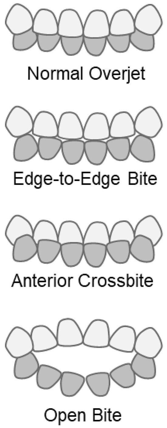 In general, occlusion status is diagnosed by dentists and classified into detailed categories, such as normal occlusion, incisal occlusion, reverse occlusion, open bite, crossbite, overbite, and maxillary protrusion [23,24]. However, this study relied on parents’ intraoral observations, making it difficult to conduct more advanced and specialized oral observations. Therefore, we focused on the occlusal condition of the front teeth, which can be easily assessed without specialized knowledge. We divided these into four categories: normal occlusion (normal overjet group), incisal occlusion (edge-to-edge bite group), reverse occlusion (anterior crossbite group), and open bite (open bite group).