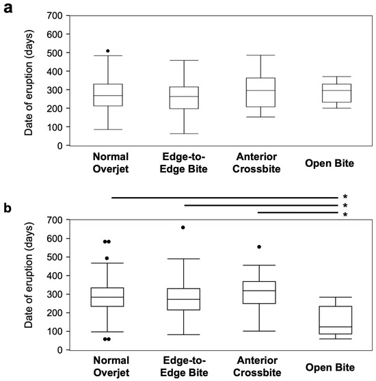 Next, when analyzing the relationship between anterior occlusion and the eruption period of primary incisors, no significant differences were observed in male participants (Figure 3a). In contrast, in female participants, the eruption period of maxillary primary central incisors was significantly earlier (p values = 0.006–0.011) in the open bite group compared with the other occlusal status groups (Figure 3b).