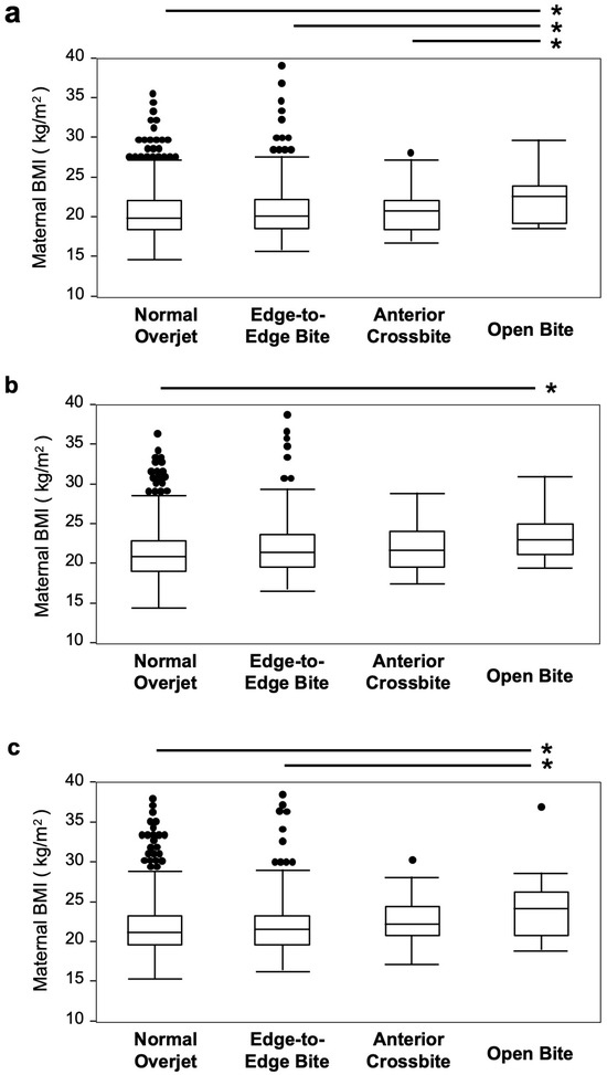 Analysis of the relationship between occlusal status and maternal BMI. Maternal BMI at (a): early pregnancy. (b): 6 months after childbirth. (c): 2.5 years after childbirth. BMI: body mass index. The black dots indicate outliers. *: p values < 0.05.