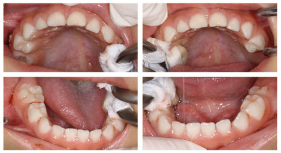 Intraoral examinations were performed by a pediatric specialist. At the first visit, 19 primary teeth except the left maxillary second primary molar erupted in the oral cavity (Figure 1). The maxillary left central primary incisor was chipped; however, no dental caries required dental treatment. Three primary second molars had erupted, and the gums were generally swollen and bled easily. The evaluation was performed according to the diagnostic criteria of the Japanese Society of Periodontology, and the patient was diagnosed with plaque-induced gingivitis [34]. He usually had his teeth brushed by his guardian at night, but this had not been possible since being hospitalized. The only drink he took was milk; owing to the effects of cancer treatment, he had difficulty eating meals and did not eat snacks. We conducted oral health instruction or fluoride application and decided to continue with follow-up during hospitalization.