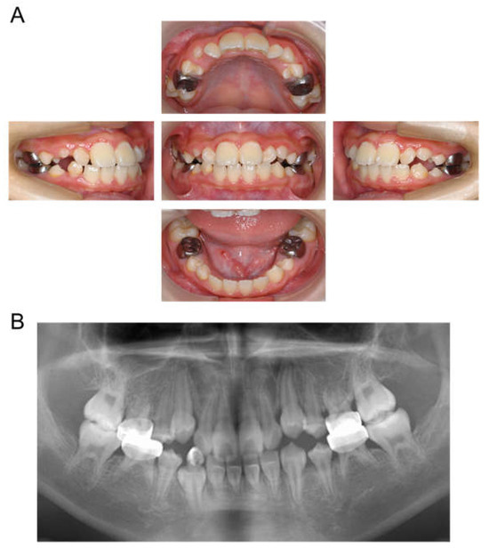 Images at the age of 10 years and 2 months. (A) Intraoral photographs. (B) Panoramic radiograph.