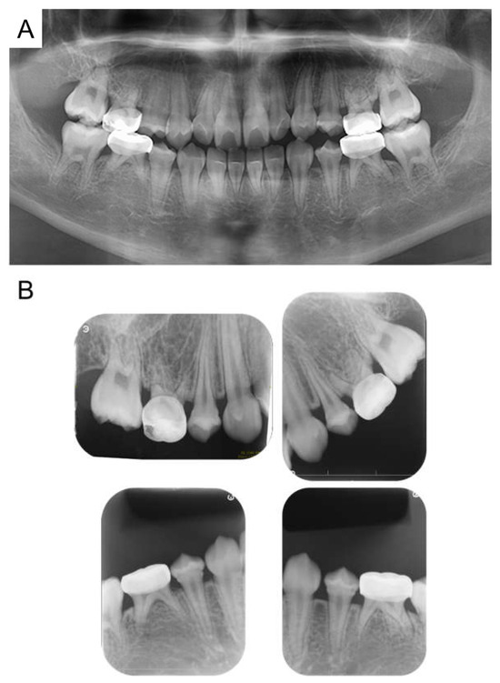Images at the age of 11 years and 6 months. (A) Panoramic radiograph. (B) Periapical radiographs.