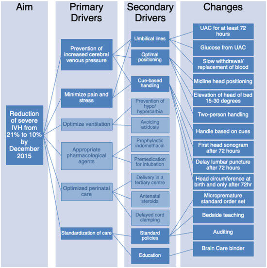 Reduction in IVH driver diagram showing the specific, measurable, applicable, realistic, and timely (SMART) aims.