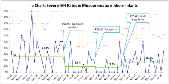 p-chart for the rate of severe IVH within the inborn micropremature population. The rate of severe IVH decreased from 21% to 10% within 10 months. PDSA #2 led to a further reduction to 6.25%, a rate that we have been unable to sustain.
