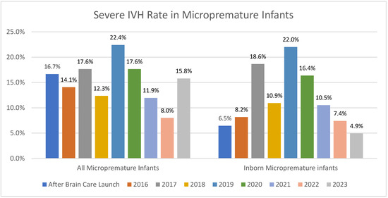 Extremely premature infants are at high risk for IVH and death [4]. With the evolution of neonatal-perinatal medicine, improvements in technology and knowledge have significantly improved the survival rates of infants born at less than 26 weeks’ gestation [5], frequently referred to as “micropremature” infants. IVH is traditionally categorized according to the stages published by Papile et al. (1978), with severe IVH being defined as intracranial hemorrhage that causes ventricular enlargement with blood in the ventricles and/or parenchymal injury or Papile’s stage 3 or 4 [6]. Due to the immaturity and fragility of the neonatal brain, micropremature infants are at high risk of severe IVH, which is strongly associated with adverse long-term neurodevelopmental outcomes and death [1,7,8].
