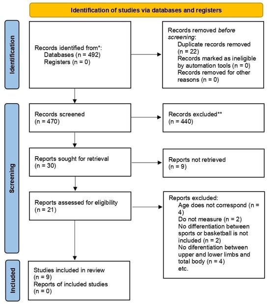 A flow chart (Figure 1) shows the selection process of the studies included in the meta-analysis. A total of 492 articles were identified from the databases used. A search was carried out with a cut-off date of January 2024. A total of 22 articles were eliminated as duplicates, reducing the number an overall of 470 articles. A total of 449 articles were eliminated for the following reasons: (1) the title and abstract were not related to the search objectives; (2) participants did not meet the inclusion criteria; (3) the studies did not measure BMD; and (4) the participants were not solely involved in basketball. Subsequently, 21 articles were considered eligible for inclusion in the meta-analysis, according to the inclusion criteria. Four articles were excluded because they were conducted in adults or in combination with them; two articles because they did not measure BMD; another two articles because no distinction was made between sports or because basketball was not among the sports; and four articles were excluded because BMD was not measured as distinguishing between lower and upper limbs and total body (Supplementary Material, Table S2). Finally, 9 articles were selected, which met the inclusion criteria for meta-analysis (Figure 1).
