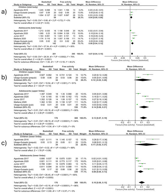 The lower limb BMD was measured in six studies included in the meta-analysis, comparing basketball vs. free activity. (MD 0.10; CI 0.06 to 0.15; p < 0.001; I2 = 86%) (Figure 2c). The first section included studies involving children [12,15] and observed an increase in BMD in favor of basketball players (MD 0.17; CI −0.02 to 0.37; p = 0.08; I2 = 89%). The second section included studies involving adolescents [13,15,23,24,26] and observed an increase in BMD in favor of basketball players (MD 0.08; CI 0.04 to 0.13; p < 0.001; I2 = 85%). The study that had the most weight (17.1%) was located in the second section [23]. No significant differences were observed between the groups of children and adolescents (Figure 2c).