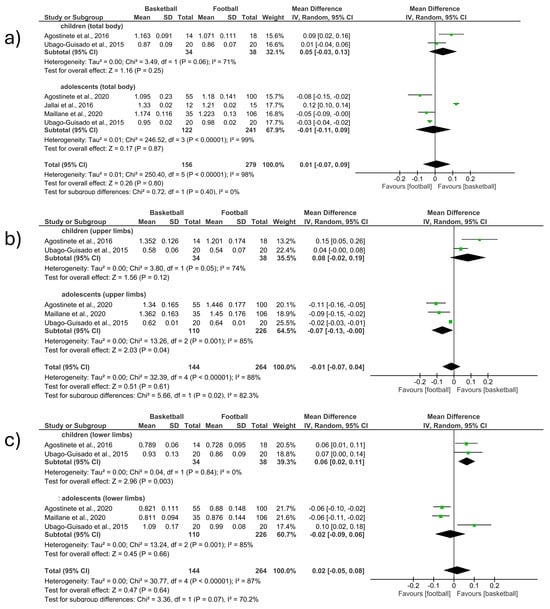 The lower limb BMD was measured in four studies included in the meta-analysis, comparing basketball vs. football (MD 0.02; CI −0.05 to 0.08; p = 0.64; I2 = 87%) (Figure 3c). The first section included studies involving children [12,15] and observed an increase in BMD in favor of basketball players (MD 0.06; CI 0.02 to 0.11; p = 0.003; I2 = 0%). The second section included studies involving adolescents [13,15,24] and observed an increase in BMD in favor of football players (MD −0.02; CI 0.09 to 0.06; p = 0.66; I2 = 85%). The study that had the most weight (21.7%) was located in the second section [24]. No significant differences were observed between the groups of children and adolescents (Figure 3c).