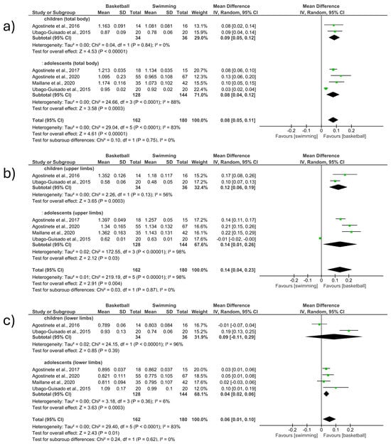 The lower limb BMD was measured in five studies included in the meta-analysis, comparing basketball vs. swimming. (MD 0.06; CI 0.01 to 0.10; p = 0.01; I2 = 83%) (Figure 4c). The first section included studies involving children [12,15] and observed an increase in BMD in favor of basketball players (MD 0.09; CI −0.11 to 0.29; p = 0.39; I2 = 96%). The second section included studies involving adolescents [13,15,24,26] and observed an increase in BMD in favor of basketball players (MD 0.04; CI 0.02 to 0.06; p < 0.001; I2 = 6%). The study that had the most weight (20%) was located in the second section [23]. No significant differences were observed between the groups of children and adolescents (Figure 4c).