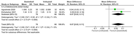 The total body BMD was measured in two studies included in the meta-analysis, comparing basketball vs. volleyball. (MD 0.07; CI 0.02 to 0.11; p = 0.006; I2 = 0%) (Figure 5) [24,25]. The study that had the most weight (50.6%) was Etchebeher et al. [25]. All participants who played volleyball were adolescents (Figure 5).