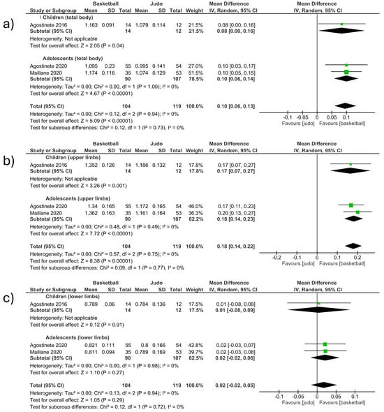 The lower limb BMD was measured in three studies included in the meta-analysis, comparing basketball vs. judo. (MD 0.02; CI −0.02 to 0.05; p = 0.29; I2 = 0%) (Figure 6c). The first section included studies involving children [12] and observed an increase in BMD in favor of basketball players. The second section included studies involving adolescents [13,24] and observed an increase in BMD in favor of basketball players. The study that had the most weight (42.8%) was located in the second section [24]. No significant differences were observed between the groups of children and adolescents (Figure 6c).