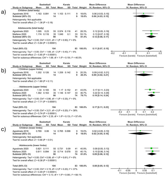The lower limb BMD was measured in three studies included in the meta-analysis, comparing basketball vs. karate. (MD 0.08; CI 0.05 to 0.12; p < 0.001; I2 = 37%) (Figure 7c). The first section included studies involving children [12] and observed an increase in BMD in favor of basketball players. The second section included studies involving adolescents [13,24] and observed an increase in BMD in favor of basketball players. The study that had the most weight (40.9%) was located in the second section [24]. No significant differences were observed between the groups of children and adolescents (Figure 7c).