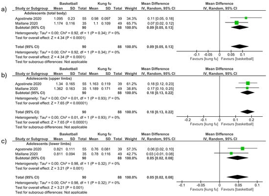 The lower limb BMD was measured in two studies included in the meta-analysis, comparing basketball vs. judo in adolescents (MD 0.05; CI 0.02 to 0.08; p = 0.001; I2 = 0%) (Figure 8c).