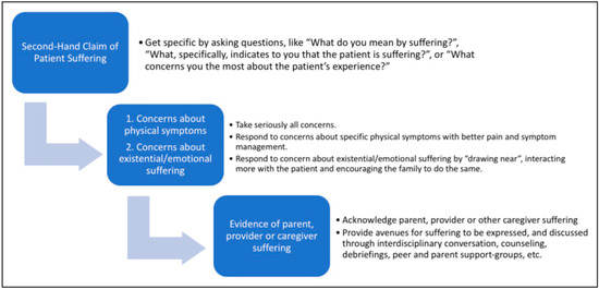 In her article, Erica Salter argues that “like “futility”, claims of patient “suffering” have been used (perhaps sometimes consciously, but most often unconsciously) to smuggle value judgments about quality of life into decision-making” [6]. She argues that using the blanket term “suffering” may conceal the speaker’s own concerns about the patients. This illustrates the importance of good communication in uncovering what “suffering” means to the caregiver and the healthcare team. She gives recommendations for responding to claims of patient suffering (see Figure 1) [6] (p. 9).