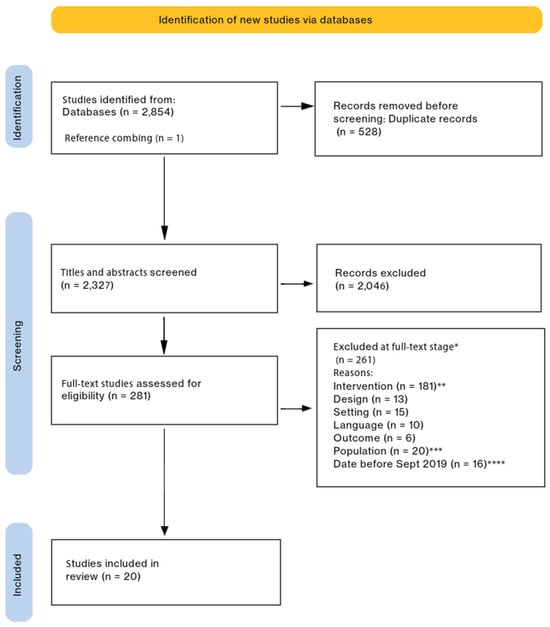 We searched the databases PubMed, CINAHL, Embase, PsycInfo, and Web of Science for research published on or after 1 January 2017. We later limited the search to five years by excluding studies published prior to 1 September 2019. See Supplementary Table S2 for the search strategies for each database. We completed the search on 14 February 2023 and updated the search on 6 February 2024 and again on 1 September 2024. See Table 1 for the details of the inclusion and exclusion criteria. We imported the title/abstract results from the database searches into the Covidence software, Melbourne, Australia, [24] to identify and remove duplicates.