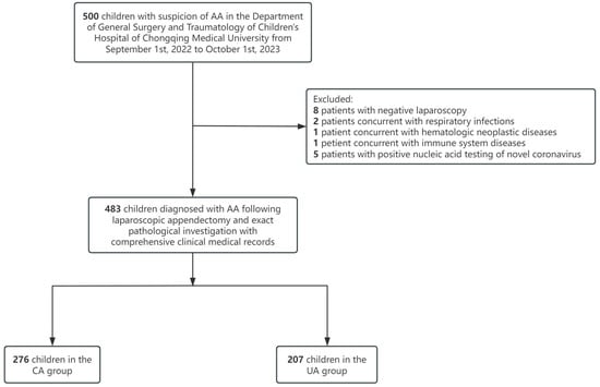 A total of 483 children diagnosed with AA in the Department of General Surgery and Traumatology of Children’s Hospital of Chongqing Medical University from 1 September 2022 to 1 October 2023 were recruited in this study. Patients with affirmed localized McBurney point tenderness, with or without positive ultrasound outcomes were considered as suspect AA. Inclusion criteria were as follows: (1) children diagnosed with AA following laparoscopic appendectomy and exact pathological investigation; (2) comprehensive clinical medical records. Exclusion criteria: (1) children with suspicion of AA undergoing laparoscopy but found not to have inflamed appendices; (2) concurrent with respiratory and urinary tract infections and other infectious disorders, inflammatory diseases; (3) concurrent with hematologic neoplastic diseases; (4) concurrent with immune system diseases; (5) positive nucleic acid testing of novel coronavirus. The study design is shown in Figure 1. This study was approved by the Ethics Committee of the Children’s Hospital of Chongqing Medical University (approval number: 98/2023).