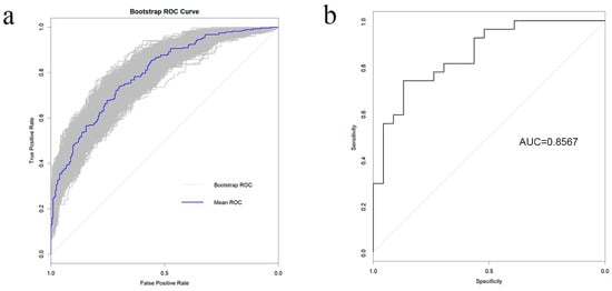Model performance. (a) ROC curve of 1000-time bootstrap; (b) ROC curve of external test.