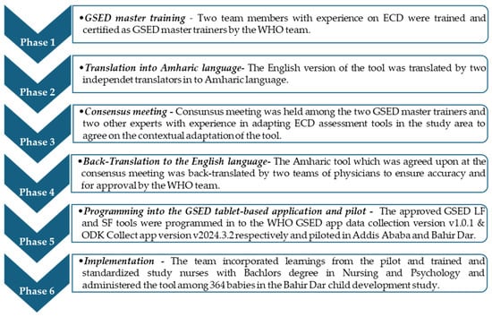 The government of Ethiopia has long acknowledged the importance and value of investing in ECD, since 2005, and developed the first Early Childhood Care and Education Policy Framework in 2010. The national ECD strategic plan is implemented under the child health program, with the major objective that all children grow and thrive in a secured, safe, and nurturing environment [,]. In Ethiopia, 60% of children are estimated to be at risk of suboptimal development due to multiple factors, starting with pregnancy, undernutrition, and lack of responsive child care, stimulation, and safety []. Thus, there is a need for accurate, culturally appropriate measures of child neurodevelopmental progression in the Ethiopian context to support policies and programs designed to enhance early childhood well-being and address developmental delays at a population level. We introduced the WHO GSED into Ethiopia for the first time and translated and adapted the tool in collaboration with the WHO. This article presents the first-time use of the GSED in Ethiopia, capturing insights into the operational, cultural, and technical aspects of its deployment. By highlighting our experiences, we aim to provide a practical roadmap for future applications in similar settings, ultimately supporting Ethiopia’s efforts to address developmental needs in early childhood and meet the United Nations’ Sustainable Development Goals (SDGs) for child development.