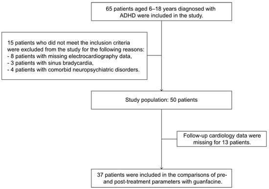 A total of 65 patients who met the inclusion criteria were initially enrolled in the study. Among these, eight, three, and four patients were excluded due to missing cardiology data, sinus bradycardia (heart rate < 60 bpm), and comorbid neuropsychiatric disorders, including autism spectrum disorder and bipolar disorder, respectively. Of the remaining 50 patients with complete baseline ECG and hemodynamic data, 13 were further excluded due to having missing follow-up ECG and cardiology parameters. Consequently, 37 patients were included in the final evaluation of the effects of guanfacine treatment on cardiology parameters (Figure 1).