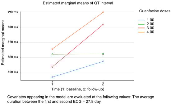 An ANCOVA analysis with repeated measures was conducted to evaluate the effects of guanfacine dose, the time interval between the first and second ECGs (used as a covariate), and their interactions on the parameters that showed significant differences between the baseline and follow-up evaluations (the QT interval, heart rate, and P wave axis). The analysis revealed a significant effect for the time interval on the changes in the QT interval (p = 0.019, partial eta squared = 0.175) (Table 5). The increase in the QT interval was more pronounced in patients receiving higher guanfacine doses (3.00 mg and 4.00 mg) (Figure 2).