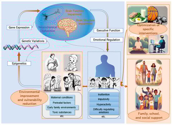 Over the past several decades, research has shown that ADHD results from a complex interaction of genetic, environmental, and neurocognitive factors. Environmental factors, such as prenatal stress, maternal smoking, and early family environments, significantly increase the risk of ADHD, especially during critical periods of brain development [15,16,17,18,19]. Genetic predispositions also play a critical role, with studies indicating that first-degree relatives of individuals with ADHD are two to eight times more likely to develop the disorder [20,21]. Epigenetic mechanisms further connect genetic and environmental factors by regulating gene expression in response to influences like prenatal stress and nutrition [22,23]. At the neurocognitive level, ADHD is linked to imbalances in neurotransmitters such as dopamine, norepinephrine, and serotonin. It is also associated with structural and functional abnormalities in brain regions involved in executive functions, including the prefrontal cortex and caudate nucleus [24,25,26,27,28,29]. Building on these findings, theoretical models have been developed to explain ADHD. The Executive Function Model suggests that the core problem lies in deficits in executive functions, such as working memory, self-regulation, inhibitory control, and time management. These deficits lead to the key symptoms of inattention, impulsivity, and hyperactivity, which are tied to disruptions in prefrontal inhibitory control [30]. The Dual Pathway Model proposes two main pathways: one related to executive dysfunction and the other to motivational deficits, which are reflected in a heightened aversion to delayed rewards. This model helps explain the social and academic difficulties often seen in children with ADHD [31,32].