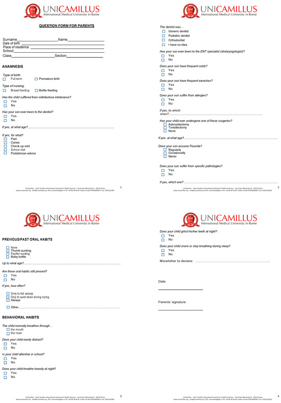 - A questionnaire, distributed in advance to the parents and/or guardians of the children involved, with open-ended questions regarding remote history and current oral and habitual behaviors (Figure 1);