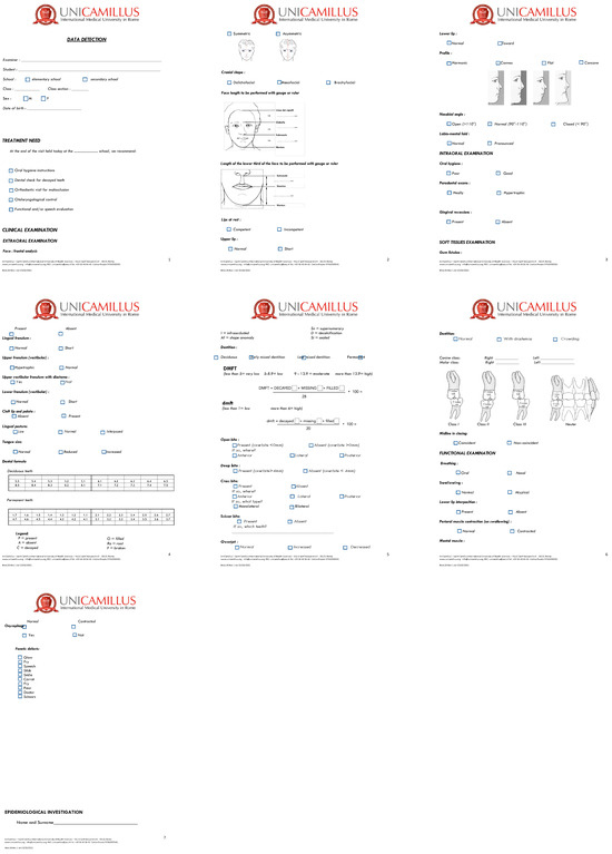 - A medical record filled out by the practitioners in charge of disease detection during the visit, consisting of forty closed-ended items and divided into five parts (extra-oral clinical examination, intraoral clinical examination, soft tissue analysis, dental formula, functional clinical examination of swallowing, breathing, and phonetics) (Figure 2).