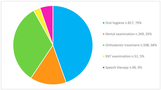 Regarding the treatment needs of every subject, the following situation was observed (Figure 3): Of the total number of subjects, 817 subjects needed a professional oral hygiene session (79%), 269 subjects needed a dental examination (26%), 598 subjects needed orthodontic treatment (58%), 51 subjects needed an otorhinolaryngological visit (5%), and 96 subjects needed speech therapy (9%). More than one specific treatment need was present in the same subject.
