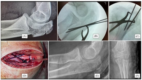 - Perkins, C.A.; Busch, M.T.; Christino, M.A.; Axelrod, J.; Devito, D.P.; Fabregas, J.A.; Flanagan, J.C.; Murphy, J.; Olszewski, D.; Schmitz, M.L.; et al. Olecranon Fractures in Children and Adolescents: Outcomes Based on Fracture Fixation. J. Child. Orthop. 2018, 12, 497–501. [Google Scholar] [CrossRef]