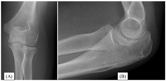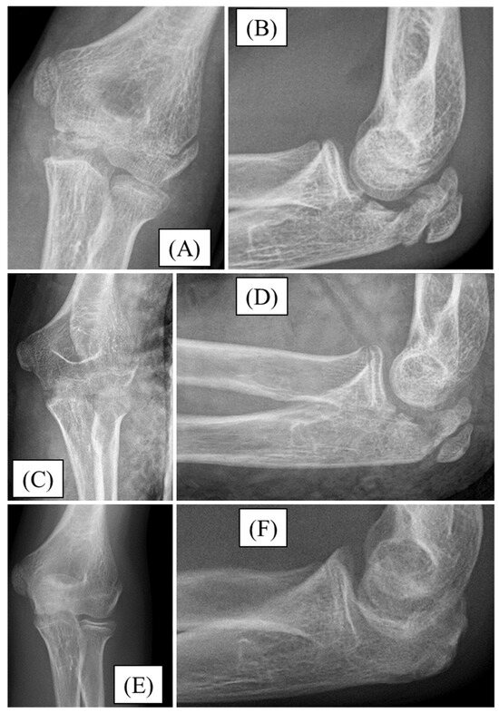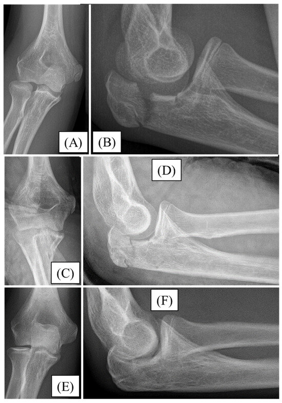 - DeFroda, S.F.; Hansen, H.; Gil, J.A.; Hawari, A.H.; Cruz, A.I. Radiographic Evaluation of Common Pediatric Elbow Injuries. Orthop. Rev. 2017, 9, 7030. [Google Scholar] [CrossRef]