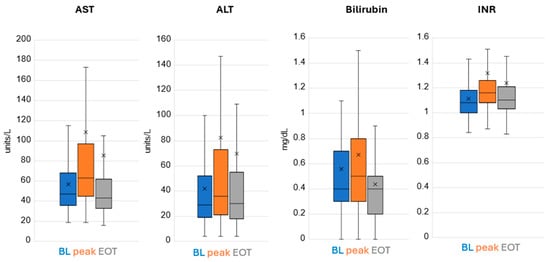 Hepatic Labs. Lower and upper box boundary 25th and 75th percentiles, respectively; inside line box median, lower and upper error line 10th and 90th percentiles, respectively. X is the mean.