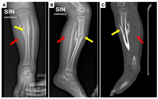 Radiological examinations performed at the Regional Hospital. (A) X-ray anterior–posterior projection; (B) X-ray lateral projection; (C) computed tomography (CT) scan of the lower left leg. Marked sclerotic hyperostosis in soft tissue (red arrows) around the fracture zone and non-union of tibial mid-diaphyseal fracture (yellow arrows) with moderate angular deformation (~15o) can be seen.