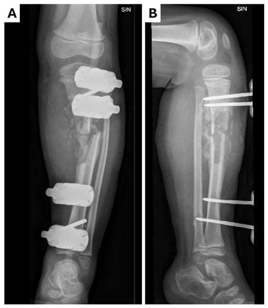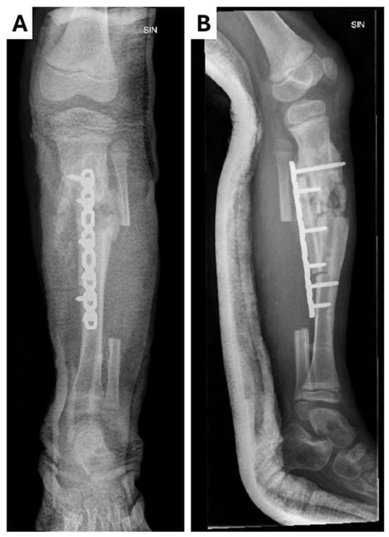 Radiological examinations of the left leg showing chronic osteomyletic changes in the tibial diaphysis in the (A) X-ray anterior–posterior projection; (B) X-ray lateral projection. A proximal–distal osteotomy of the tibia was performed, resecting the pseudoarthrosis and exposing the bone surfaces. A proximal–distal osteotomy of the fibula was also performed, along with the rotation of the bone fragments to place them in the defect around the pseudarthrosis. Osteosynthesis was performed with a locked plate and five screws while maintaining the axis of the bone. A sterile aseptic dressing and plaster cast were applied.