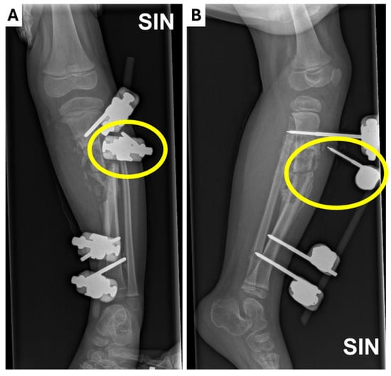 Radiological examinations of the left leg showing the dislocation of one of the external fixators (yellow circle) in the (A) X-ray anterior–posterior projection; (B) X-ray lateral projection.