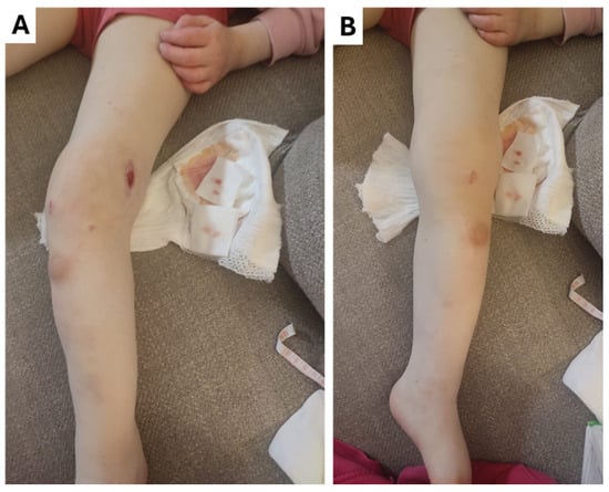 A 3-year-old female paediatric patient with known mutations in the NTRK1 gene (Table 1) was presented to the Regional Hospital in Ventspils, Latvia, in July 2023. According to the patient’s medical history, she was diagnosed with CIPA at the age of two months. Her parents reported that she does not experience pain or sweating. The patient is a child of non-consanguineous parents. The patient has been observed to exhibit recurrent self-injurious behaviour, characterized by the deliberate tearing of the skin from her fingers, and damage to her buccal mucosa and tongue. The patient’s mother had expressed concern, noting that the abrasions tended to not heal adequately; the patient was prone to frequent superficial cutaneous, oral, and genitourinary infections; and that the patient often had an elevated body temperature. There was also a known history of osteomyelitis in the bones of the hand that was treated conservatively using antibiotics.