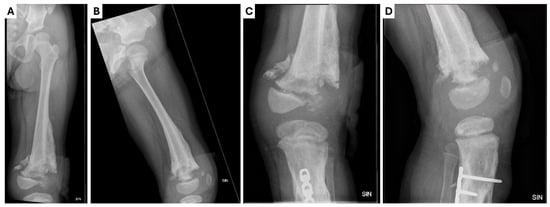 X-ray examination of the (A,B) left hip joint and (C,D) femur and knee joint in anterior–posterior and lateral projections showing a small, heterogeneous lateral condyle of the femur, a lytic zone in the metaphysis, massive calcification in the mid-diaphysis, a normal hip joint gap, smooth surfaces, and no pathologies in the hip joint bones.