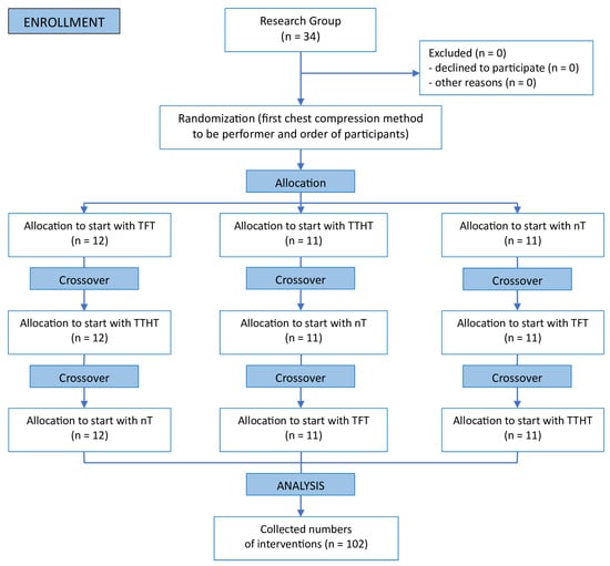 This study was designed as a randomized crossover trial aimed at comparing the following three infant chest compression techniques: the two-finger technique, the two-thumb encircling technique, and the new author’s technique. The trial was conducted in a controlled simulation environment and adhered to international ethical guidelines for research involving human participants. The study was approved by the Institutional Review Board of the Polish Society of Disaster Medicine (IRB No. 43-2024-0312-IRB).