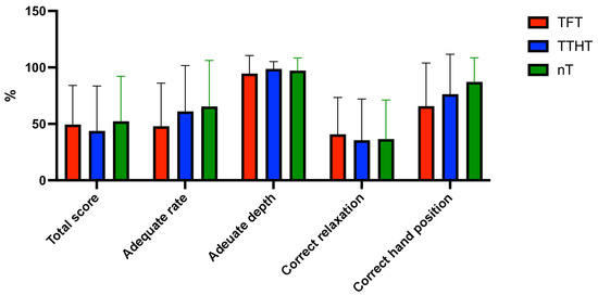 The incidence of proper hand positioning was highest in the nT (87.24 ± 21.38%), with statistically significant variations observed among approaches (p = 0.031, ANOVA). Post hoc analyses revealed a significant difference between the TFT and nT (p = 0.011), although comparisons between the TFT and TTHT (p = 0.263) and the TTHT and nT (p = 0.145) were not statistically significant.
