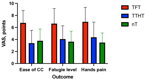 Significant differences in hand pain were also identified (p < 0.05, ANOVA), with the TFT being associated with the highest reported discomfort (6.93 ± 2.41), followed by the TTHT (4.36 ± 2.53) and nT (3.48 ± 1.60). Post hoc analyses confirmed that the TFT caused significantly more hand pain than the TTHT (p < 0.001) and nT (p < 0.001). Additionally, the TTHT resulted in significantly greater pain than nT (p = 0.049; Table 2).