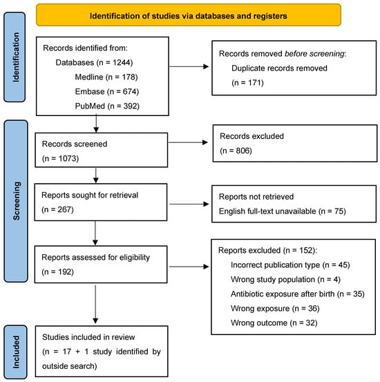 Figure 1 outlines the process of study selection through study identification, title/abstract screening, and full-text screening. From 1244 records identified by searching the three databases (Medline, Embase, and PubMed), 1073 papers underwent title/abstract screening after removing 171 duplicate records. A total of 267 passed title/abstract screening and underwent full-text screening, resulting in 17 studies eligible for inclusion. We further included one study from the grey literature.