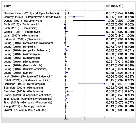 Pooled prevalence of childhood hearing loss from all included studies [10,26,27,28,29,30,31,32,33,34,35,36,37,38,39,40,42]. Note: ES: effect size; myxtamycin*: equal proportion of streptomycin and dihydrostreptomycin; Others*: *sulfamethoxazole, trimethoprim, cefotetan, ceftriaxone, cephalexin, cefazolin; Gentamicin/Clindamycin*: during labor.