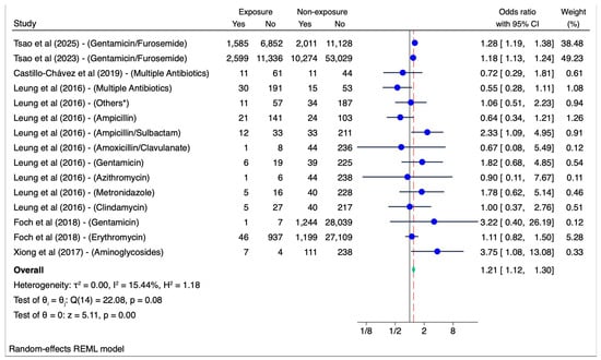 Overall association between antibiotics during pregnancy and offspring hearing loss [26,27,28,29,30,31]. Others*: *sulfamethoxazole, trimethoprim, cefotetan, ceftriaxone, cephalexin, cefazolin.